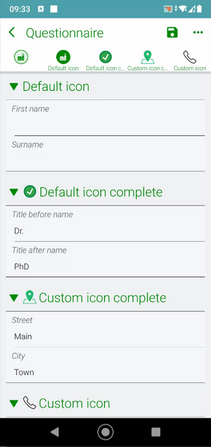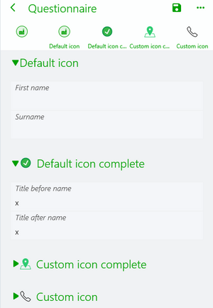 As described above, you can add custom icons. The standard file name must match the name of the questionnaire group. Add the "-" suffix for selected icons and "-complete" suffix for complete icons.