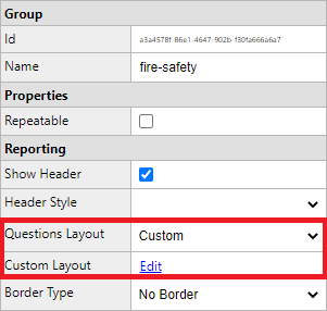 - Select a question group and on the Properties pane, set Questions Layout to Custom, then click Edit.