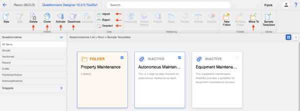 To make the management of questionnaires, folders, and snippets easier, Questionnaire Designer now allows you to select multiple items and perform bulk actions.