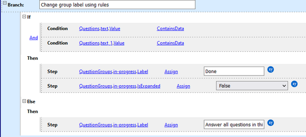 You can now modify the label of questionnaire groups using rules. For example, the following rule will change the label of a group to "Done" when all questions are answered.