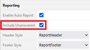This checkbox applies to automatic reports and newly created custom reports. If you want to update an existing custom report to use the same functionality, you must set up the Visibility property of each question. Use the virtual property IsAnswered in curly brackets.