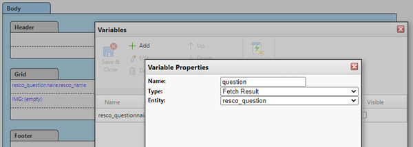 - Add a new variable of the type Fetch Result for the entity resco_question.
