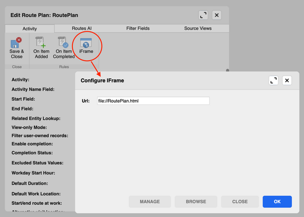 • Route plan configuration in Woodford now includes a new parameter Activity Name Field which allows you to define which field is displayed as the title of the record in the list and on the map.